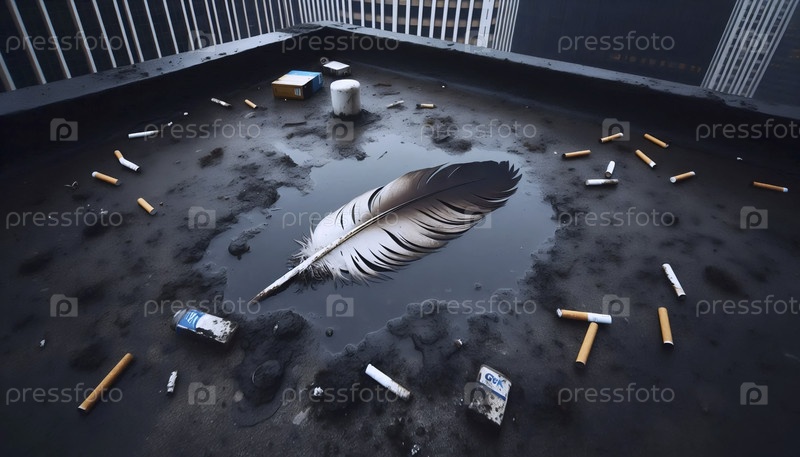 Широкий снимок крыши с перьями в фокусе, за ним городская туманность, Ай создал изображение