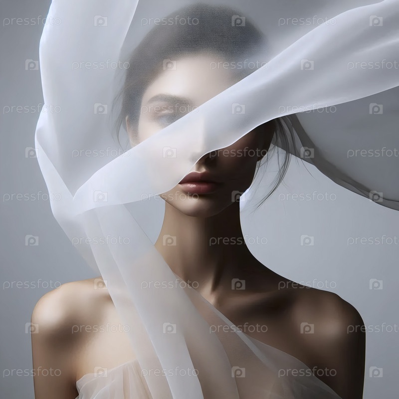 Женщина наполовину завуалирована плавающей белой тканью, Ai generated image