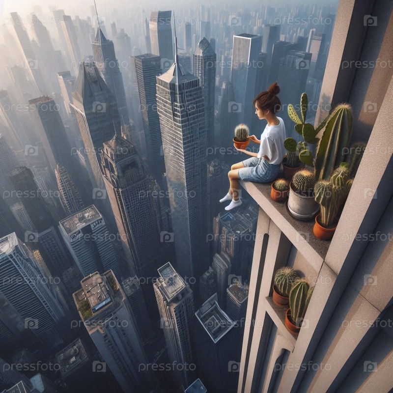 Женщина поливает кактус на краю небоскреба, Ai generated image