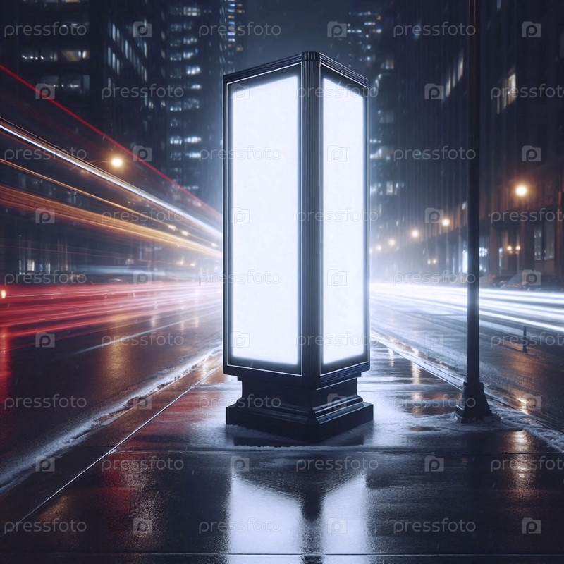 Макет рекламной колонки citylight, пустой и освещенный изнутри, на мокрой отражающейся городской тротуаре ночью Ай создал изображение