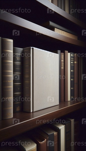 Мокет книги в жесткой обложке с пустой лентой, расположенный между другими книгами на полке, Ai generated image