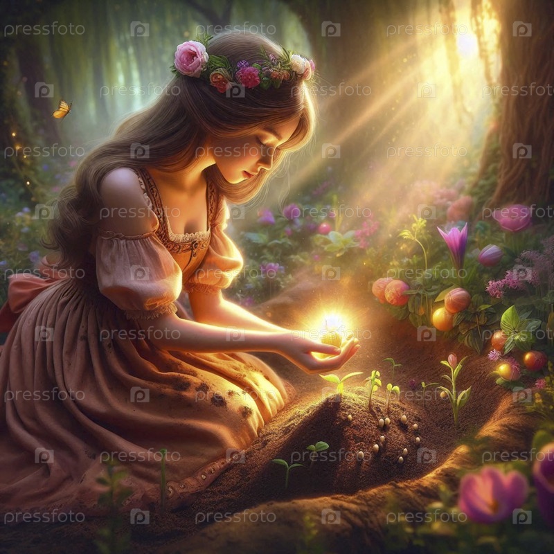 Принцесса сажает волшебное семя акварельный арт-принт, Ai A generated image