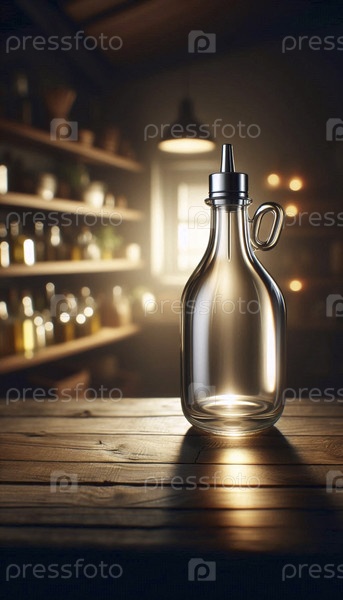 Прозрачная стеклянная бутылка с макетом слива, пустая на деревянной полке, Ai generated image