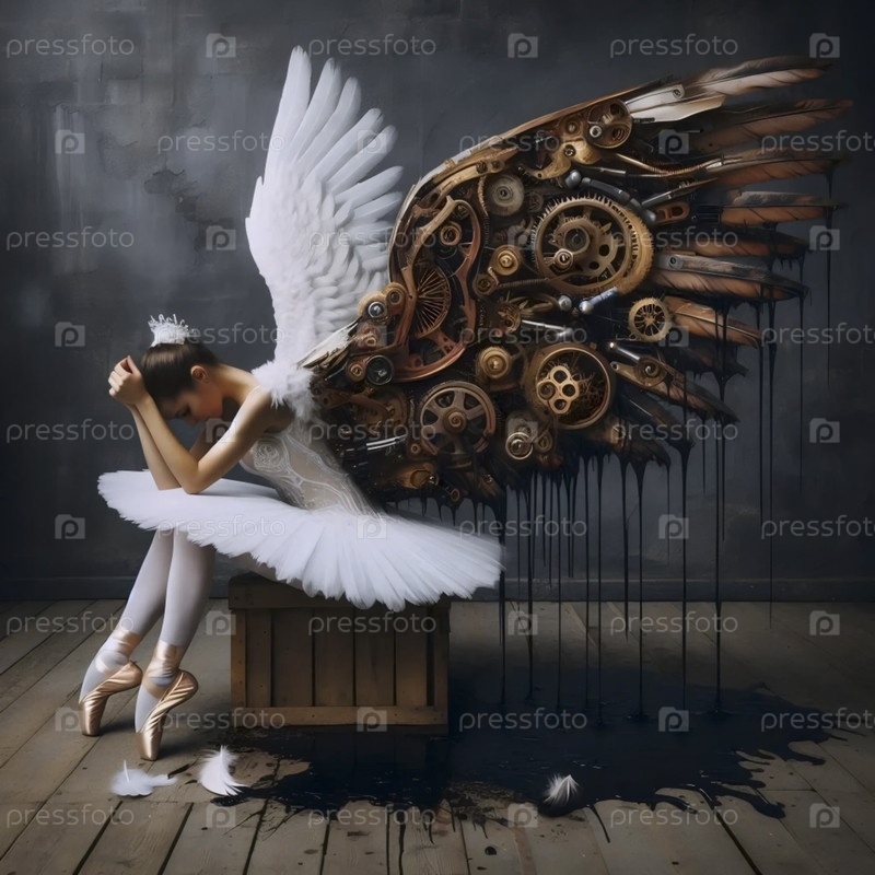Ангел-балерина со сломанным механическим крылом за кулисами, Ai generated image