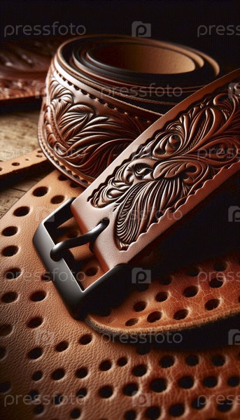 Близкий макет кожаного ремня с растительным загаром, показывающий глубокую ручную цветочную гравировку и швейные отверстия, Ai generated image