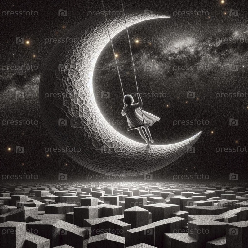 Ребенок, качающийся на полумесяце над городом, Ai generated image