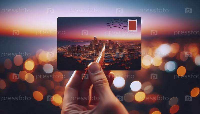 Мокет почтовой карты с глянцевым отделением, удерживаемый между большим и указательным пальцами на фоне боке городского пейзажа, Ай создал изображение