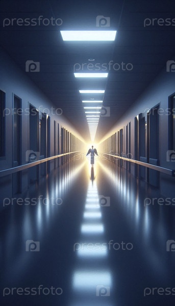 Более широкий снимок изнутри пустого коридора больницы, просматривая фигуру в окне, Ай создал изображение