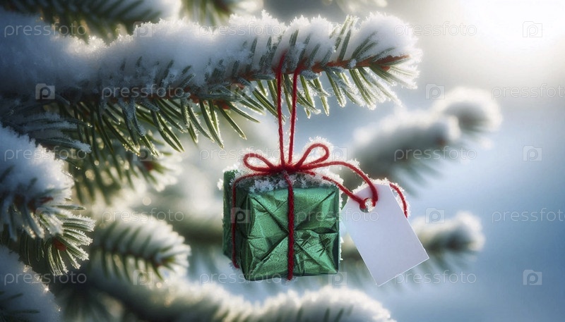 Небольшой, упакованный в фольгу подарочный макет с пустым тегом, висящий на пышной сосновой ветке, украшенный морозом, Ai generated image