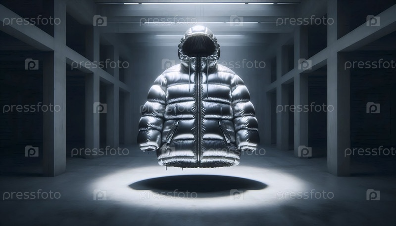 Макет сверхразмерной пузырьковой серебряной куртки, раздутой и стоящей прямо, как будто ее носит призрак, Ай создал изображение