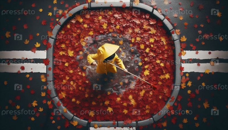Девочка в дождевом пальто, ориентирующаяся по гигантской лужайке, наполненной листьями как река джунглей, Ai generated image