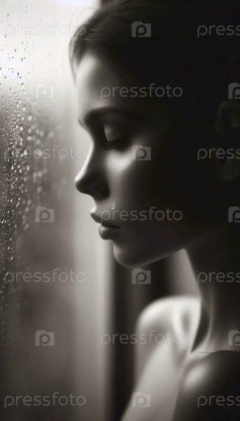 Профиль с влажной нитью против дождливого окна, Ai generated image
