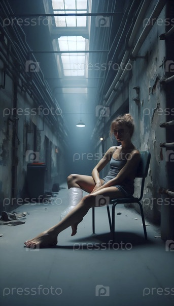 Широкий, экологический снимок, где танцовщица сидит одна на холодном металлическом стуле в туманном коридоре за кулисами