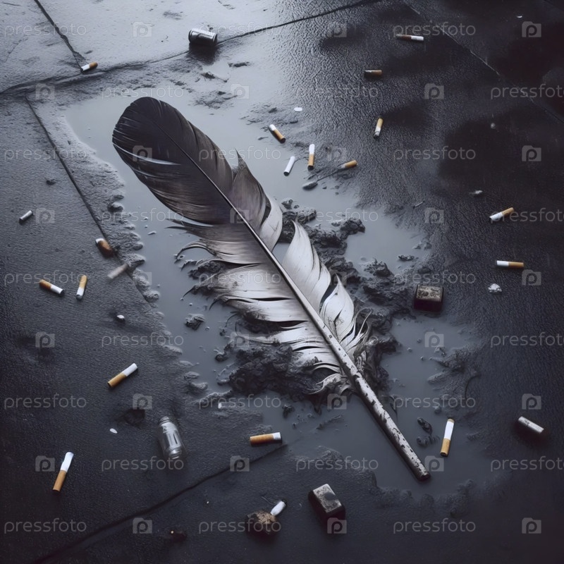 Широкий снимок крыши с перьями в фокусе, за ним городская туманность, Ай создал изображение