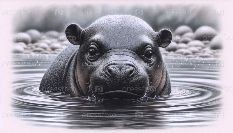 Малыш карликового бегемота в мелководной чернице рисует художественную печать, Ai generated image