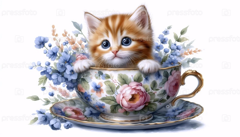 Котенок в чайной чашке Акварельная художественная печать, Ai generated image