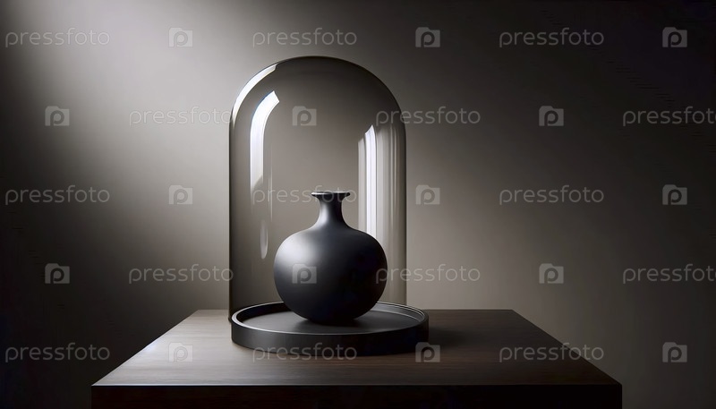 Матовый черный керамический макет вазы под большой стеклянной колокольницей на темном пьедестале из окрашенного дуба, Ai generated image