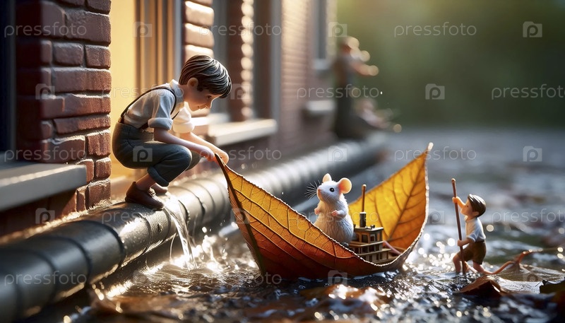 Мальчик, плавающий на лодке из листьев с пассажиром мыши в канаве, Ai generated image