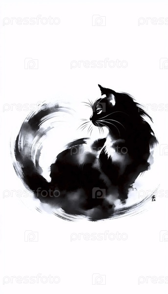 Минималистическая суми-э чернильная живопись кота, Ai generated image