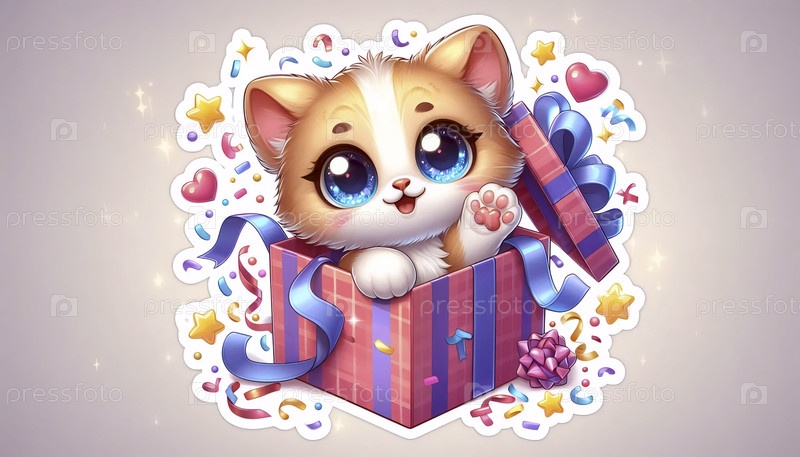 Игровой кот, заглядывающий из наклейки подарочного ящика, Ai generated image
