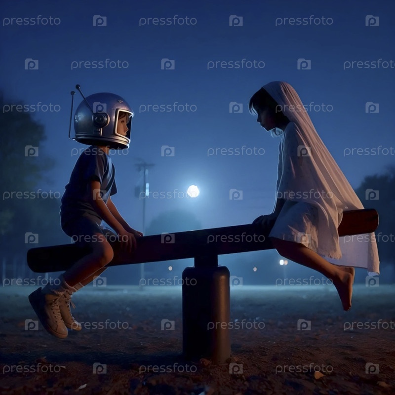 Два ребенка на санях в сумерках, Ai generated image