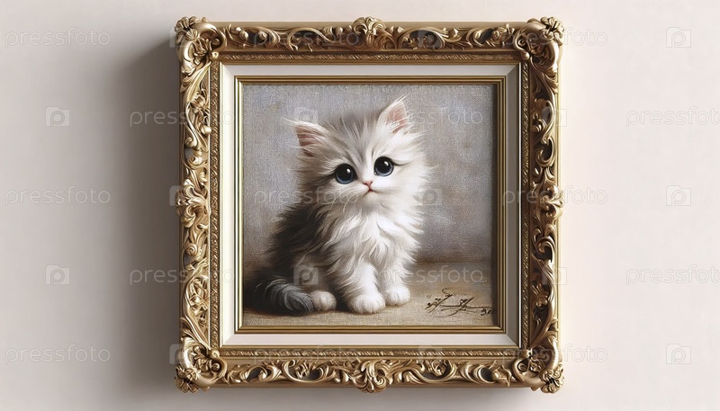 Небольшой портрет кота с золотой рамкой, масляная живопись, Ai generated image
