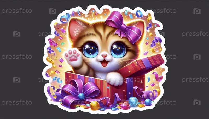 Игровой кот, заглядывающий из наклейки подарочного ящика, Ai generated image