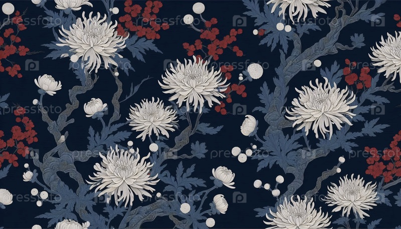 Японский цветочный рисунок темно-синий коралловый дизайн без швов, Ai generated image