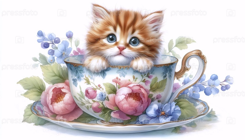 Котенок в чайной чашке Акварельная художественная печать, Ai generated image
