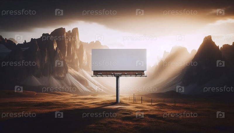 Большой прямоугольный макет рекламного щита на одном металлическом столбе, пустой и обращенный к величественному горному массиву при восходе солнца, Ай создал изображение