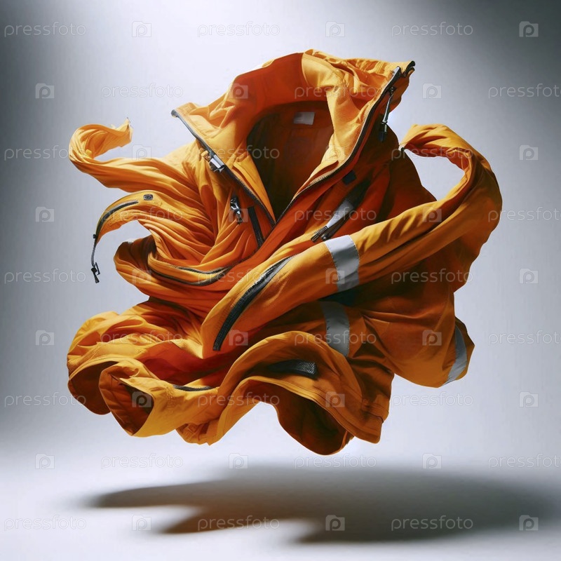Ярко-оранжевый технический макет анорака, динамически свернутый на белой велосипедной стене, Ai generated image