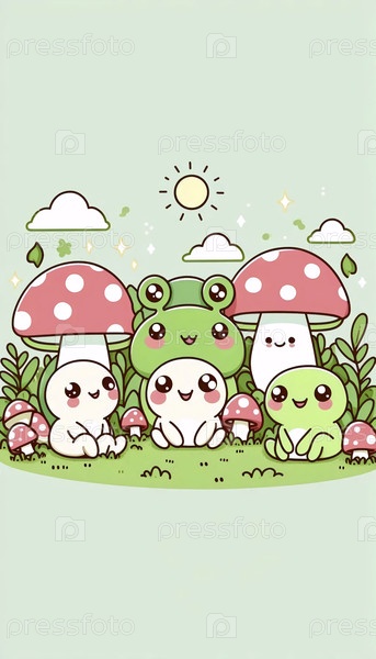 A kawaii mushroom and frog friends print, Ai generated image Аи создал изображение