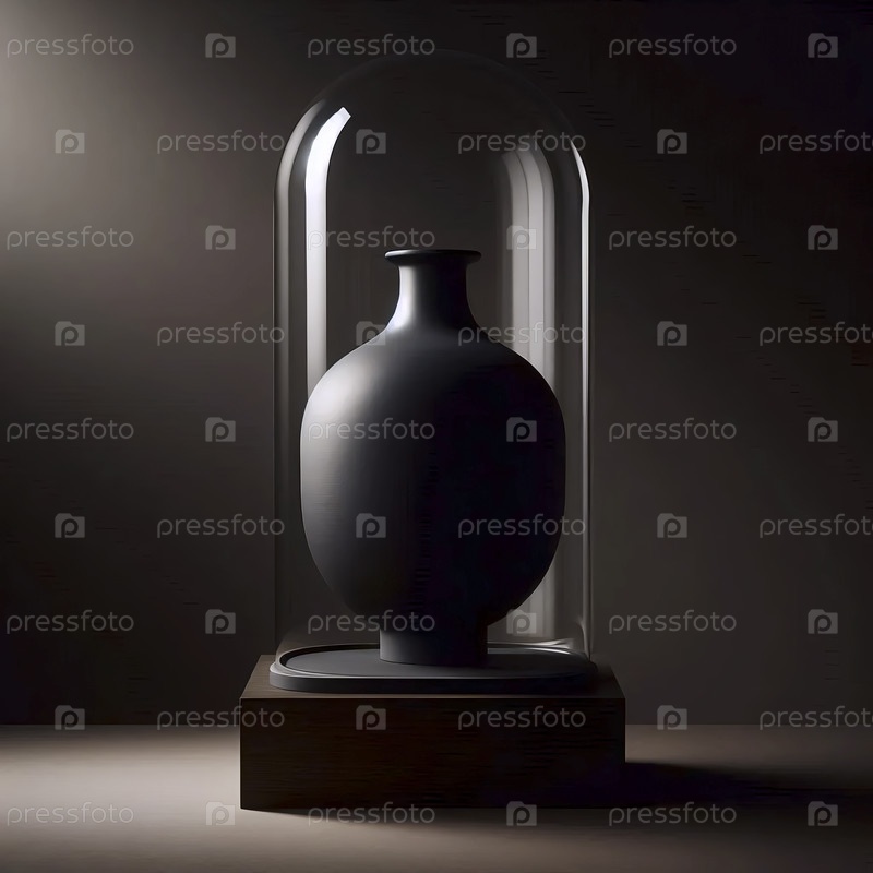 Матовый черный керамический макет вазы под большой стеклянной колокольницей на темном пьедестале из окрашенного дуба, Ai generated image