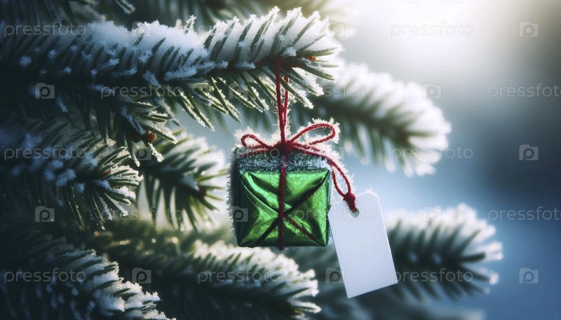 Небольшой, упакованный в фольгу подарочный макет с пустым тегом, висящий на пышной сосновой ветке, украшенный морозом, Ai generated image
