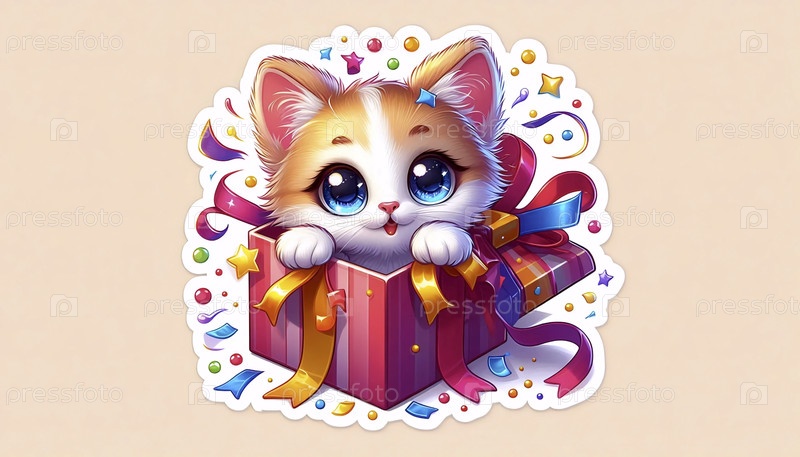 Игровой кот, заглядывающий из наклейки подарочного ящика, Ai generated image