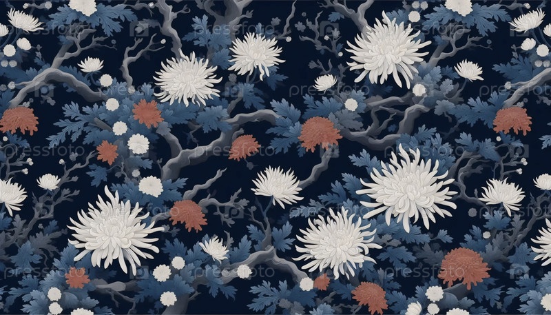 Японский цветочный рисунок темно-синий коралловый дизайн без швов, Ai generated image