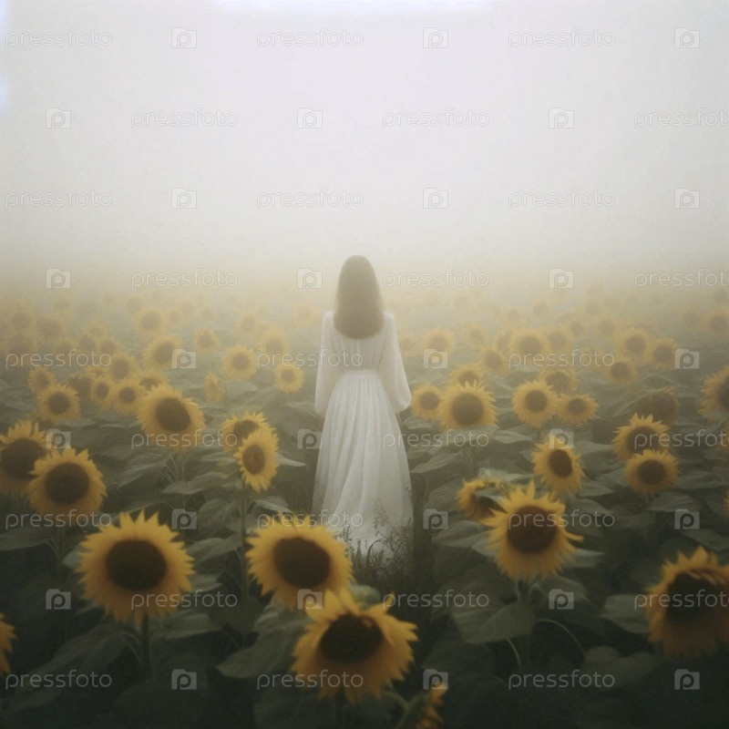 Женщина в белом среди туманного поля подсолнечника, Ai generated image