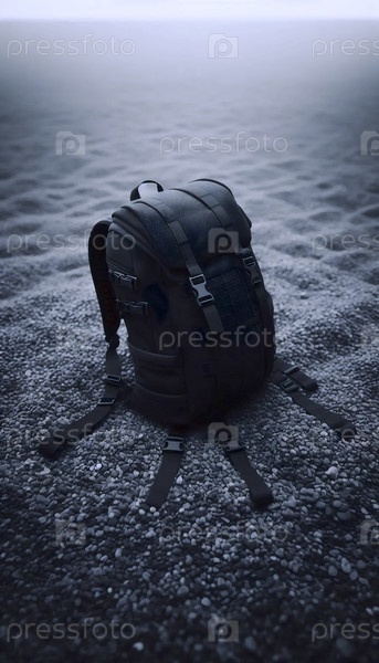 Мокет черного рюкзака из кордуры, пустой и слегка свернутый на гравийной поверхности, Ai generated image