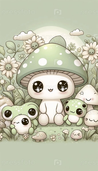 A kawaii mushroom and frog friends print, Ai generated image Аи создал изображение