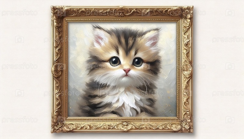 Небольшой портрет кота с золотой рамкой, масляная живопись, Ai generated image