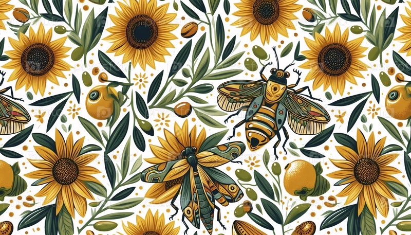 Бесшовный рисунок французской провансальной цикады и подсолнечника, Ai generated image