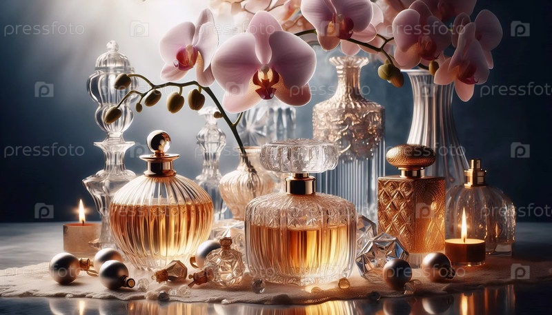 Орхидея с парфюмерными бутылками, Ai generated image