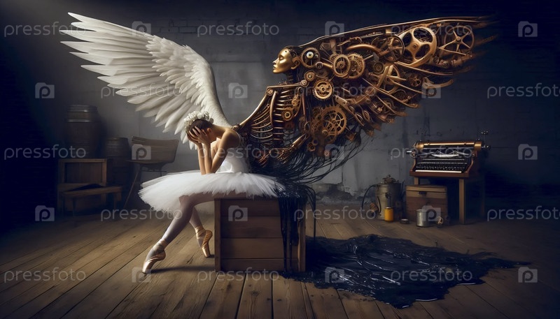 Ангел-балерина со сломанным механическим крылом за кулисами, Ai generated image