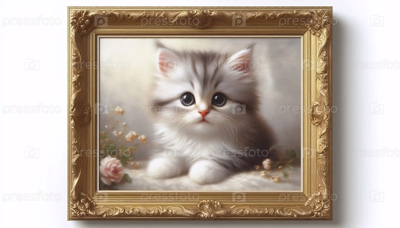Небольшой портрет кота с золотой рамкой, масляная живопись, Ai generated image