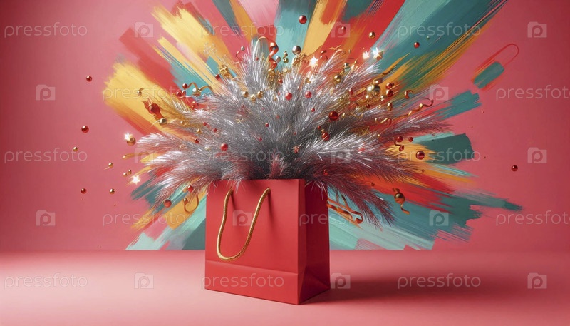 Простой бумажный макет подарочной сумки, переполненный нитями серебряного и золотого тинзеля на красочном абстрактном фоне, Ai создал изображение