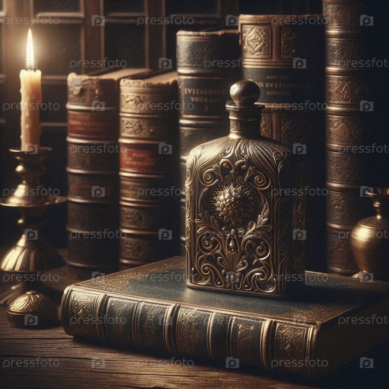 Оформленный макет бутылки парфюма в винтажном стиле, опирающийся на открытое изображение, созданное AI