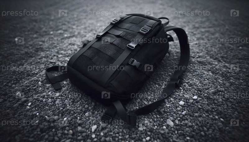 Мокет черного рюкзака из кордуры, пустой и слегка свернутый на гравийной поверхности, Ai generated image