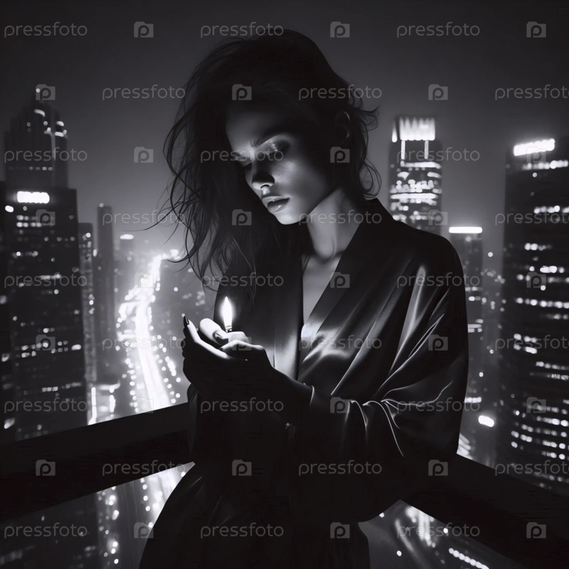 Женщина зажигает сигарету на балконе небоскреба, Ai generated image