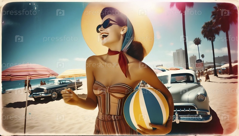 Пляжная девушка 1950-х годов с винтажным пляжным мячом, Ai generated image