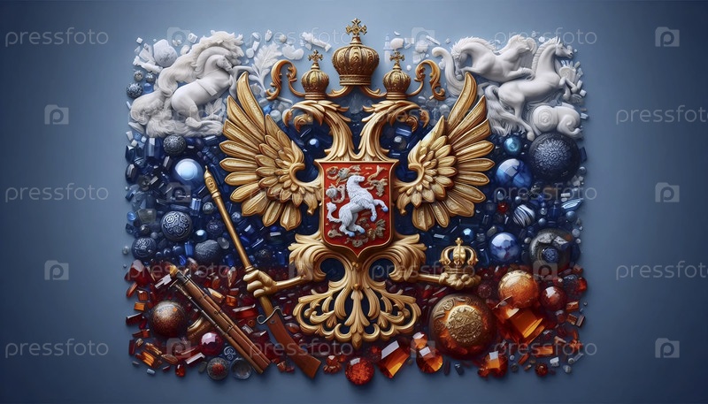Российский флаг в янтаре и золотых сокровищах, Ai generated image